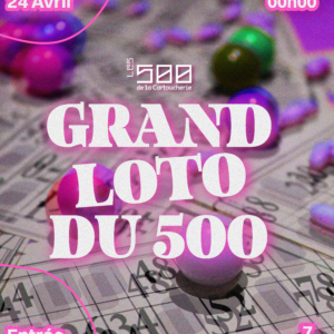 GRAND LOTO DU 500 VENDREDI 24 AVRIL – 19H30 – 00H Venez participer à notre grand LOTO DU 500 et tentez de remporter une multitude de lots au travers de 7 parties dont une carton vide ! Toute la soirée sera animée par Chloé ! On te conseille fortement de prendre ta formule cartons + […] ...